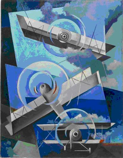 manifesta l’entusiasmo per il volo e la velocità aerea, con la scansione delle immagini per piani di colore, sottolineando il carattere meccanico e dinamico dell’aviazione. Le