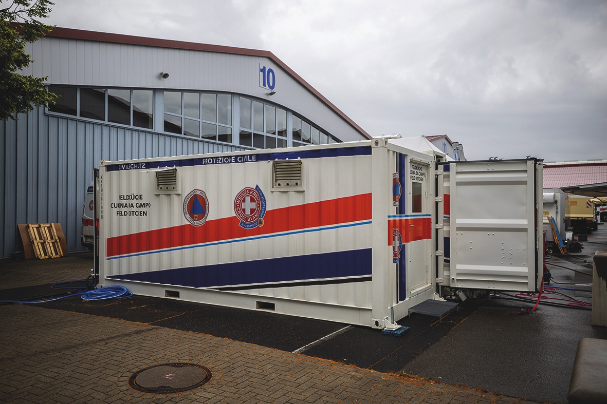 Per rendere l’assistenza più efficace ed efficiente, Croce Bianca ha deciso di modernizzare le proprie cucine container. Il risultato di anni di intensa pianificazione è una cucina da campo all’avanguardia, composta da due container combinabili: uno dedicato alla preparazione e al raffreddamento degli alimenti, l’altro alla cottura. Sul luogo di intervento, sei aiutanti impiegano circa cinque ore per montare la struttura, che ha una superficie complessiva di 40 metri quadrati. «Per queste dimensioni siamo operativi in tempi rapidissimi», sottolinea Holzknecht. Una particolarità di questa cucina è la doppia alimentazione: oltre al gasolio può funzionare anche a elettricità, garantendo maggiore potenza e tempi di cottura ridotti. Grazie a questa soluzione, Croce Bianca può servire pasti di alta qualità a 1.200 persone all’ora, rispetto alle 500 di prima.