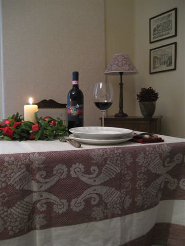 e la passione per la buona cucina. La tovaglia in questione è stata creata dalla più celebrata tessitura italiana i Busatti di Anghiari ispirandosi al Brunello “Prime Donne” di