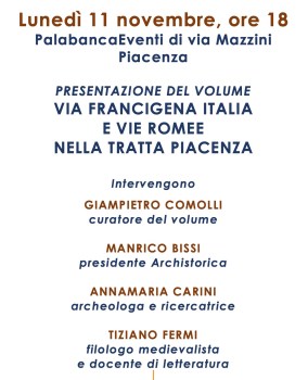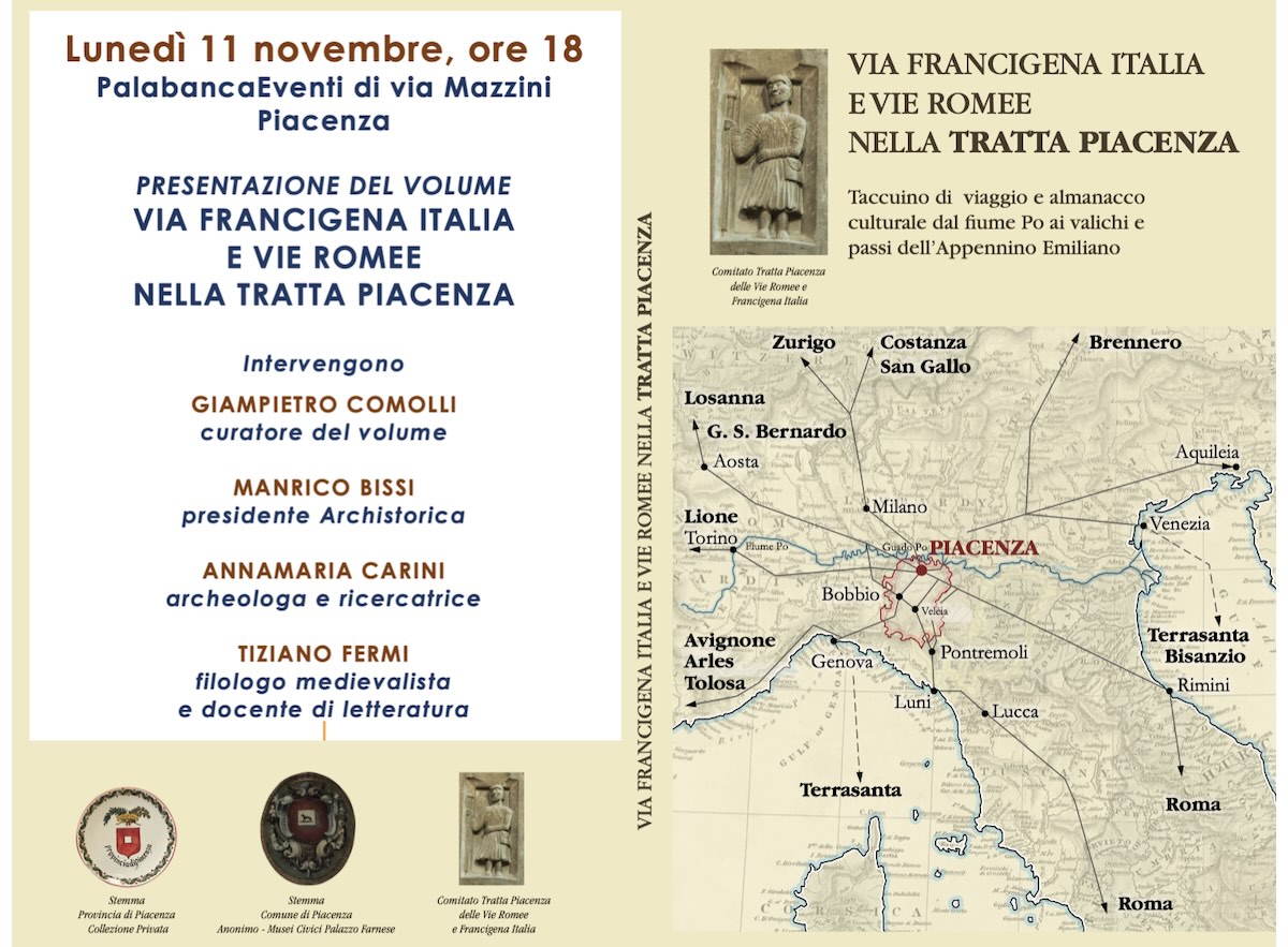 Lunedì 11 novembre, alle 18, il PalabancaEventi di via Mazzini ospiterà la presentazione del volume “Via Francigena Italia e Vie Romee nella Tratta Piacenza” (Edizioni Banca di Piacenza) di Autori Vari, pubblicazione a cura del Comitato Tratta Piacenza delle Vie Romee e Francigena Italia.